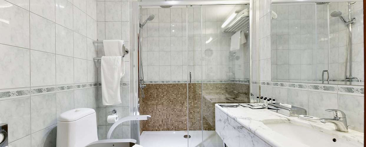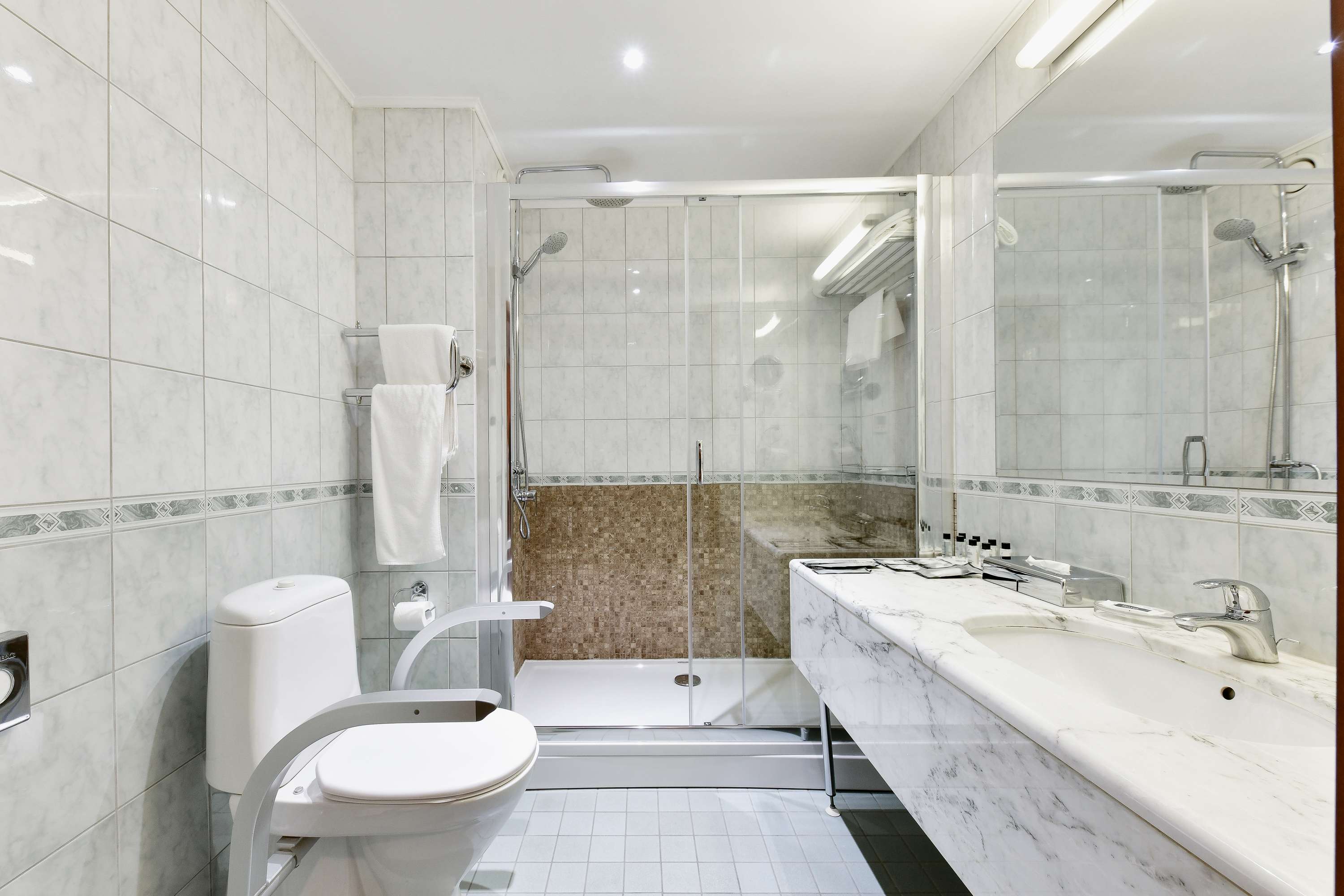 Интерьер продуман до мелочей: широкие дверные проёмы (92 см), отсутствие высоких порогов и перепадов уровня пола обеспечивают свободное перемещение по номеру. Мебель расставлена так, чтобы не создавать препятствий — есть достаточно пространства для маневрирования и лёгкий доступ ко всем функциональным зонам: кровати, рабочему столу и зоне отдыха. Санузел оборудован опорными поручнями у унитаза и кнопкой вызова персонала.