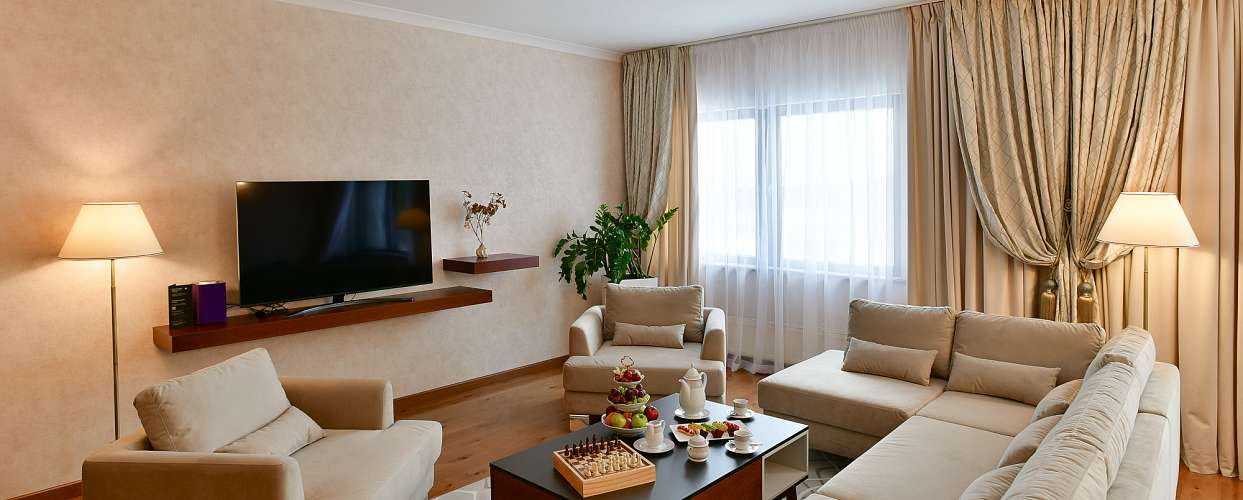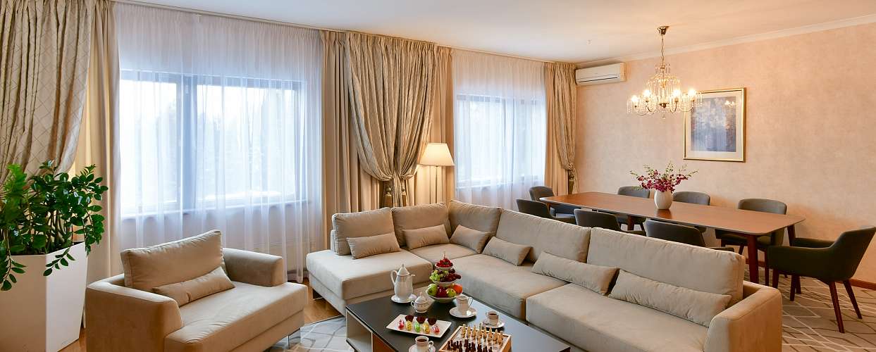 Роскошные президентские апартаменты Москоу Кантри Клаб — это изысканные интерьеры и исключительный комфорт. В трехкомнатных номерах расположены две спальни, просторная гостиная и оборудованная кухня. Площадь президентских апартаментов — 105 кв. м. Номер для некурящих.